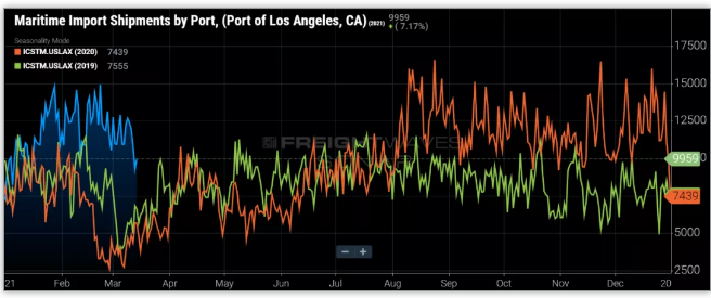Seroka说,3月的货量预计将比2月的还要高,预测为830,000 TEU,与去年3月未能达到的450,000 TEU,预计将增长80%以上。预计强劲的进口量将持续到初夏。