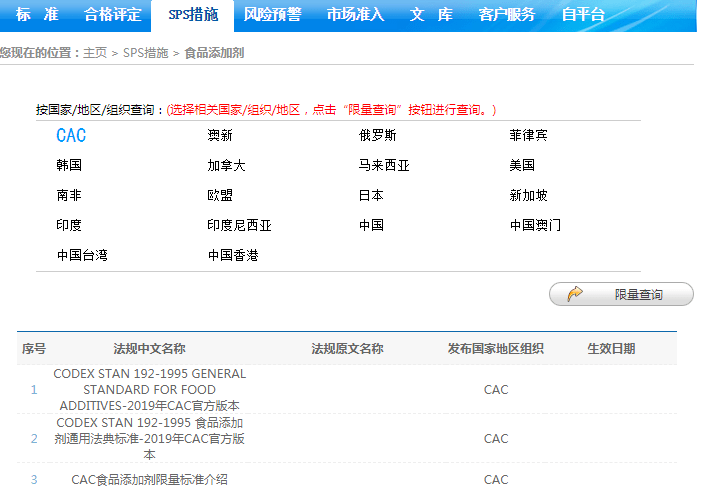 在SPS界面选择了食品添加剂,本页面中可以选择国家,如需更精准的查询,可选择限量查询