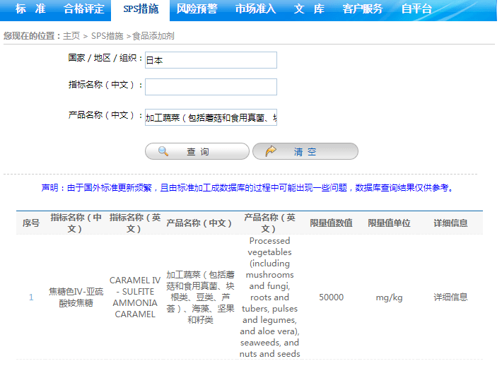 如图所示,根据国别(日本)&产品名称(加工蔬菜)可以查看日本对该类产品中食品添加剂的要求