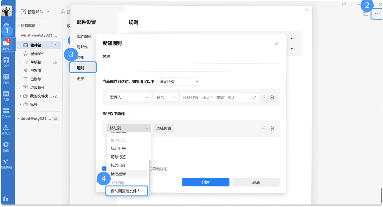 也可在企业微信客户端【邮件->邮件设置->规则】中创建规则选择“自动回复邮件给发件人“。