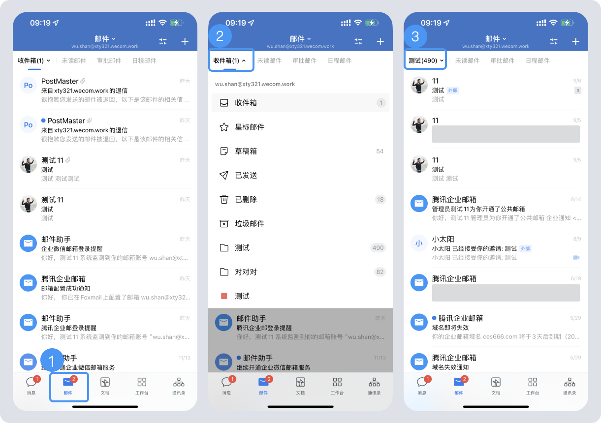 企业微信移动端点击【邮件->“收件箱⋁“】展开邮箱文件夹,可切换进入查看文件夹内的邮件。