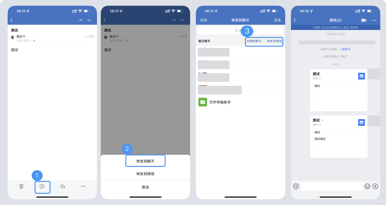 通过【企业微信->邮件】打开邮件详情点击【转发】按钮,可选择将邮件转发到企业微信对话框,支持展示邮件部分内容。