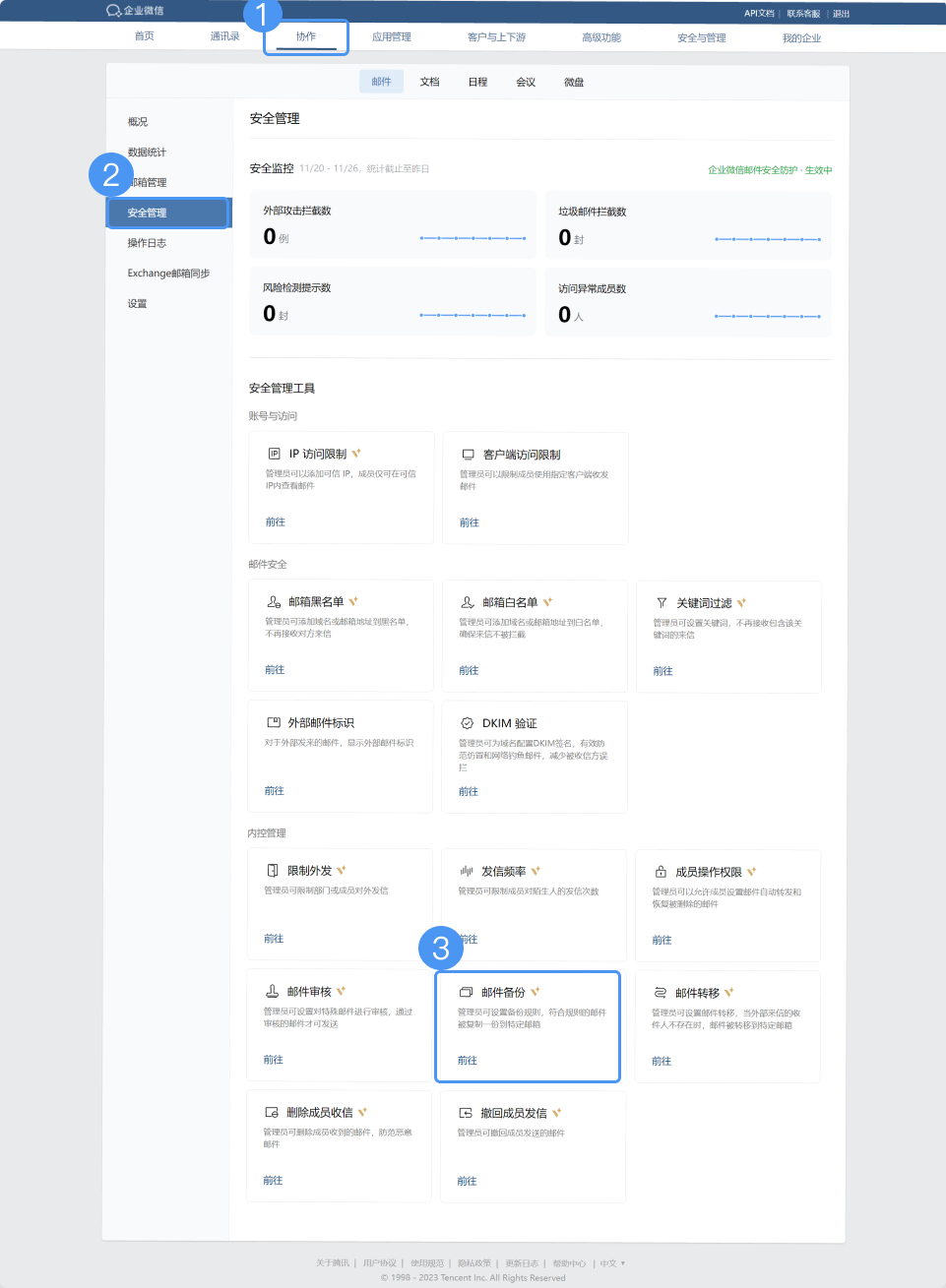 登陆企业微信管理端【协作->安全管理->邮件备份】添加备份规则。