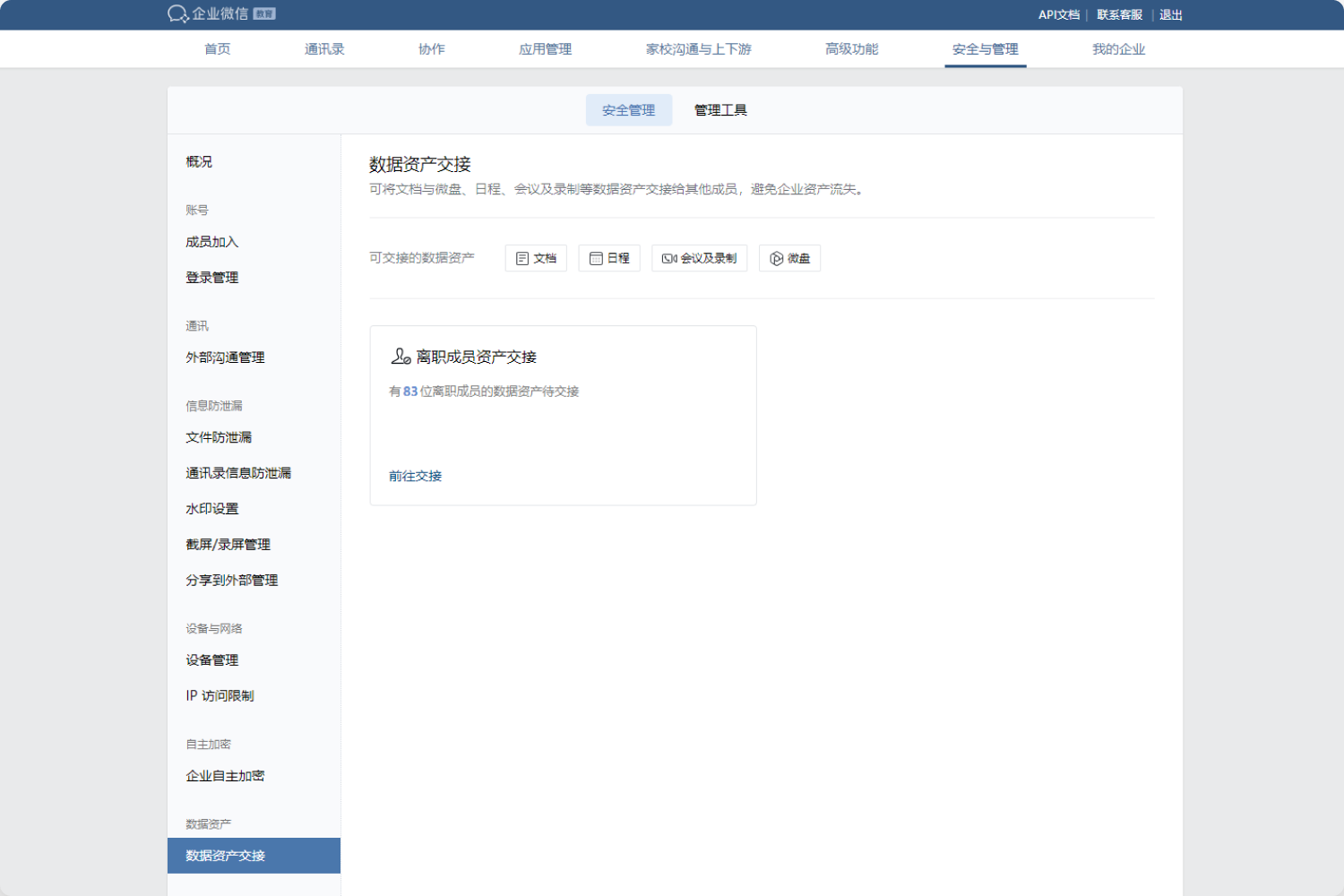超级管理员可在【管理后台->安全与管理->安全管理->数据资产交接->前往交接】中点击“去交接”查看到离职成员待交接的文档和微盘数量。