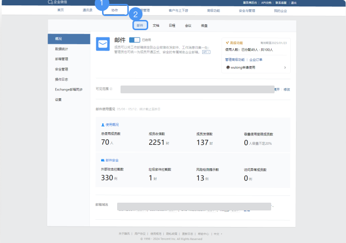 若是已有企业微信,可以直接在【企业微信后台->协作->邮件】下管理企业微信邮箱;邮件高级功能需要完成支付后才可使用高级功能特权。