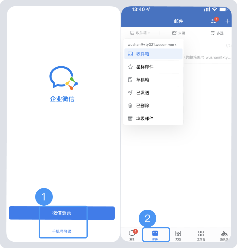 登录方式:【企业微信APP->邮件】进入企业微信关联的企业微信邮箱进行收发、查看邮箱中的邮件。
