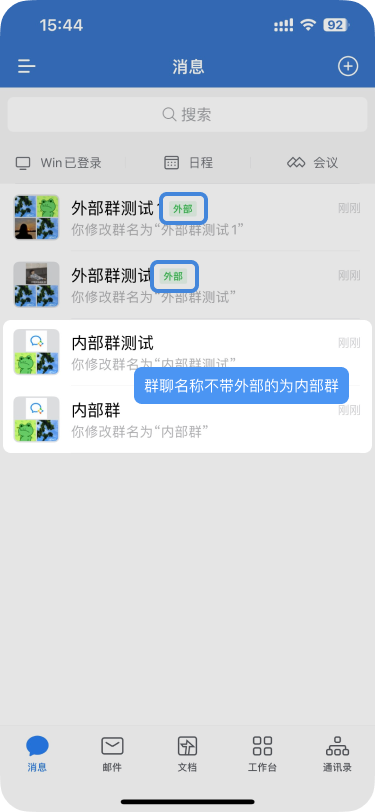 发起群聊时,若只选择企业通讯录人员,则为内部群;