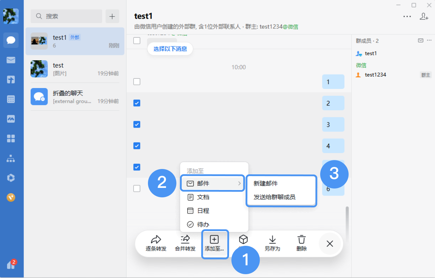 多选消息添加至邮件,可选择新建邮件/发送给群聊成员,添加后,可在邮件正文内容中查看到对应选择的消息记录,便于成员在邮件中直接查看沟通记录。