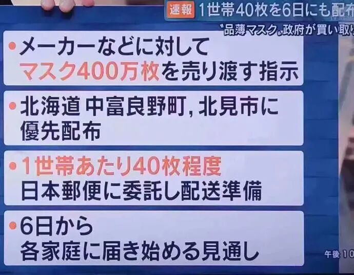 同日,官房长官菅义伟称,让全国的口罩制造商一天24小时不间断工作,上周已经初步达成1周生产1亿个口罩的速度。