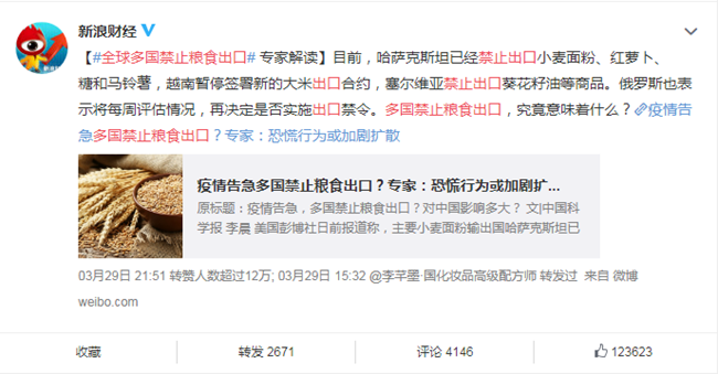 加上由于新冠肺炎疫情正在多国蔓延,一些国家陆续禁止粮食出口以保证国内粮食供应。与此同时,部分国家宣布粮仓告急,关于粮食危机的担忧四起.....