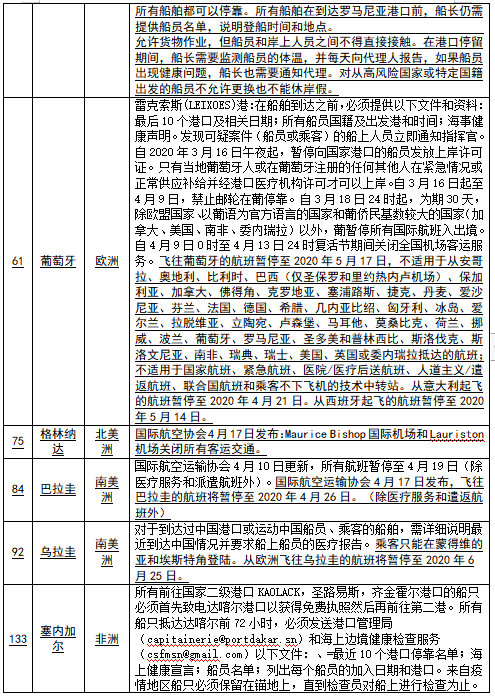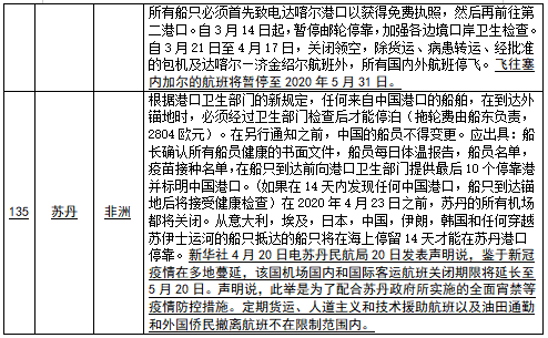对船舶/航班/列车采取措施的情况——截至4月20日,共有138个国家(地区)采取了相关措施,其中新增2个国家(地区),措施有更新的12个国家(地区)。具体如下: