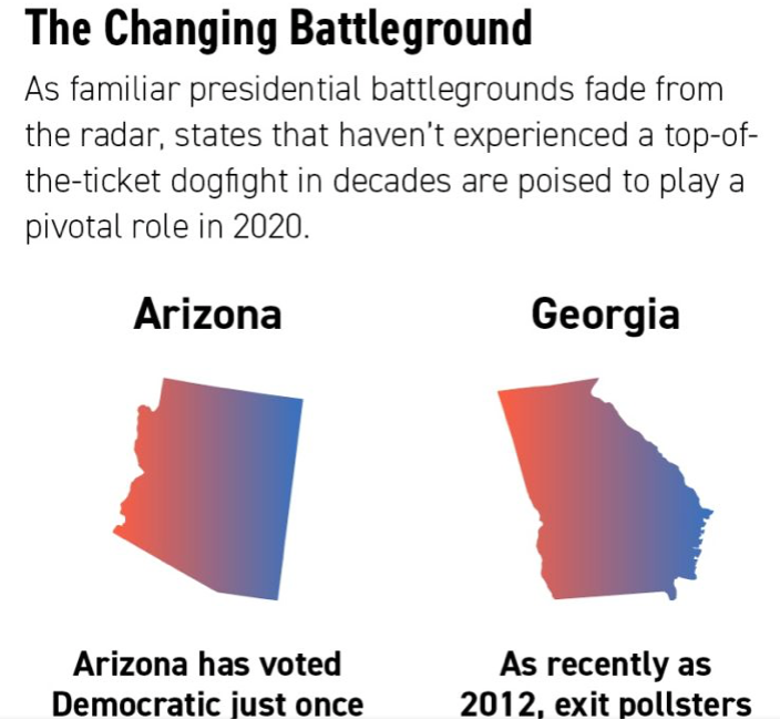这三个州共有46张选举人票,自上世纪80年代以来,这三个州都没有单独把选举人票投给共和党的候选人过,更不用说一起了。