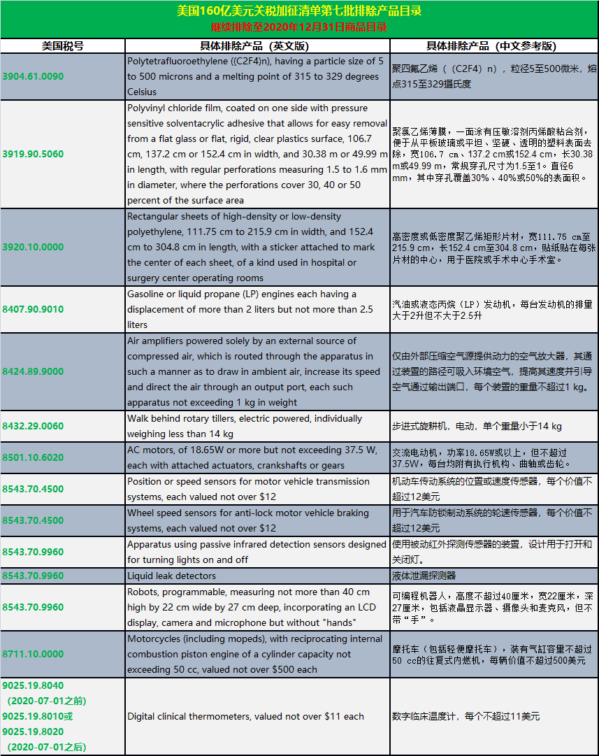 2019年7月31日针对160亿第七次排除清单共涉及34个税号69个品项的商品。此次未获得延长有效期的包括28个税号下55个品项的商品,将于2020年7月31日到期后,被移出排除清单。即2018年8月23日至2020年7月31日期间,这些商品可免加征关税,但从2020年7月31日起,恢复额外加征关税25%。(名单见列表2)