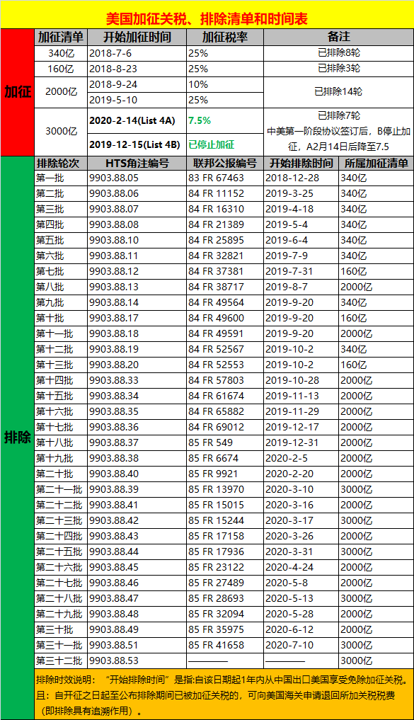 截止目前,美国共加征4个批次产品关税清单,32个轮次豁免清单。下面是对应的加征关税产品批次和豁免轮次以及对应具体执行税率、清单和时间表如下: