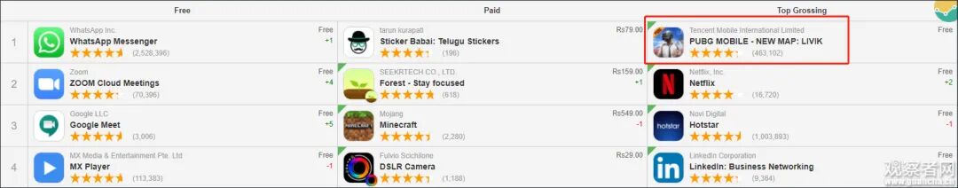 “绝地求生”是此次印媒集体关注的被禁App,该游戏在印度特别是年轻人中很火爆。根据“SensorTower”今日榜单,“绝地求生”位列iOSApp营收榜首位。