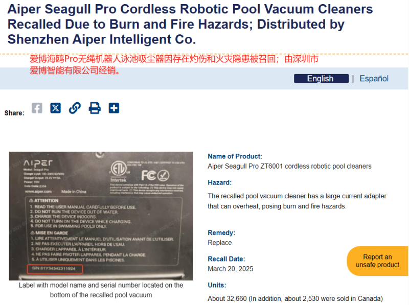 最近,加拿大卫生部发布一则召回通知,宣布召回Aiper品牌旗下的Seagull Pro ZT6001无线机器人泳池吸尘器,原因是这款产品配备的大电流适配器可能过热,造成烧伤和火灾危险。