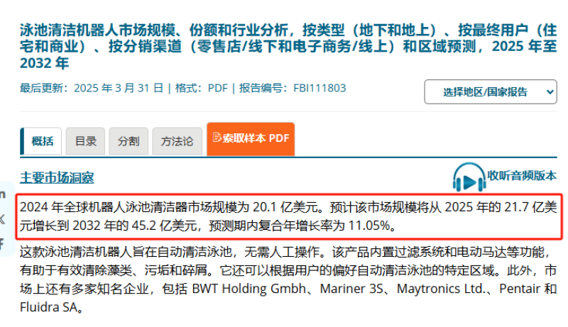 来自Fortune Business Insights的一份报告显示,全球泳池清洁机器人市场规模在2024年达到20.1亿美元,预计将以11.05%的年复合增长率持续扩张,到2032年将突破45亿美元,这一增长主要由北美和欧洲市场推动。