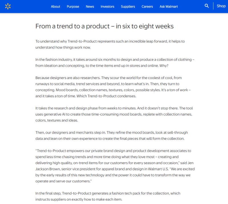 技术团队表示,以往需要六个月才能完成的时尚开发流程,如今在该AI工具协助下可压缩至约六周。沃尔玛强调,其目的并非复制快时尚模式。沃尔玛采购执行副总裁Andrea Albright指出,公司仍将严格遵循道德和社会责任采购标准,产品的交付周期仍会因关税及原产地等因素而有所差异。