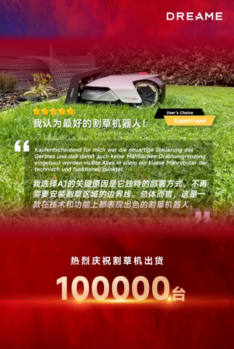 去年Prime Day期间,追觅割草机器人在西南欧市场GMV破2000万元,位居欧洲市场1000欧以上价位段TOP1。到了今年2月,追觅宣布其旗下智能割草机器人出货量正式突破10万台,发展速度相当快。
