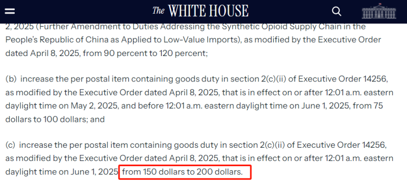 然而好景不长,T86政策最终还是难逃取消命运。根据最新的政策要求,自北京时间5月2日中午12点起,从中国内地和香港地区通过国际邮政系统进入美国境内的价值低于800美元的包裹将被将征收其货值的120%或每件100美元的关税,此前为90%或75美元。与此同时,自6月1日起,该标准将进一步上调至每件200美元,此前为150美元。