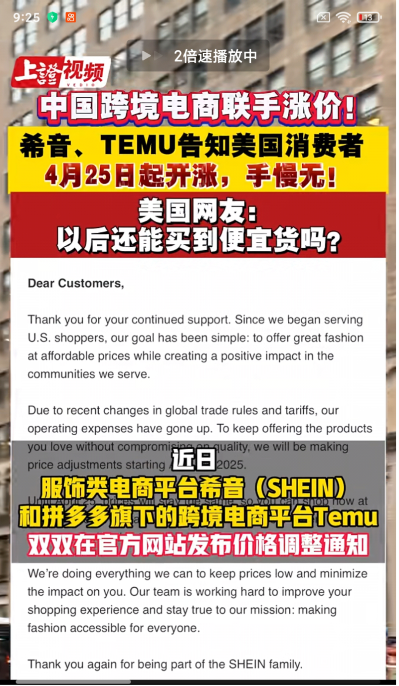 SHEIN称,为了保证产品质量,平台将从2025年4月25日起调整商品价格,并表示尽量保持低价以减少对消费者的影响。不过具体涨幅多少,SHEIN并未透露。Temu方面的通知也类似,大概意思就是“全球贸易规则和关税的近期变化导致平台的运营成本增加了,为了不牺牲产品质量,因此选择价格调整。”