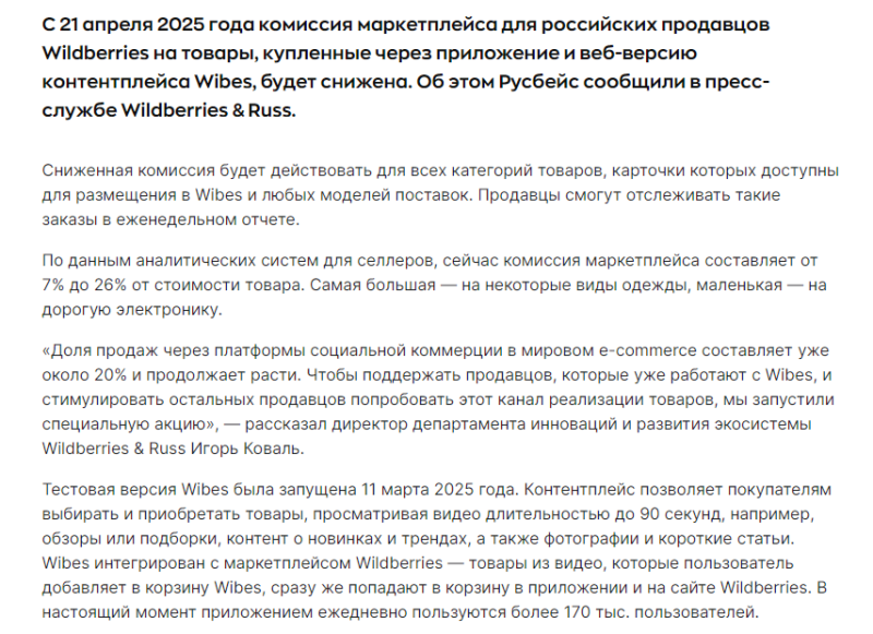 4月25日消息,Wildberries宣布自4月21日起,通过旗下社交电商应用Wibes销售商品的部分卖家已可享受最多1%的佣金下调优惠。此次调整适用于所有可在Wibes平台发布内容并支持任意交付模式的产品类别,旨在支持Wibes平台的推广与发展。