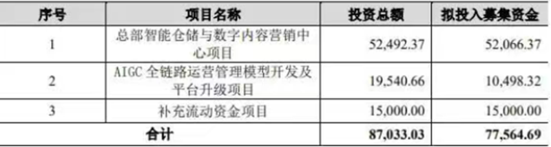 今年3月份,华凯易佰披露《向不特定对象发行可转换公司债券预案》公告称,计划发行可转债募资不超过7.76亿元,主要用于总部智能仓储与数字内容营销中心项目、AIGC全链路运营管理模型开发及平台升级项目等项目,大部分都和AI技术有关。