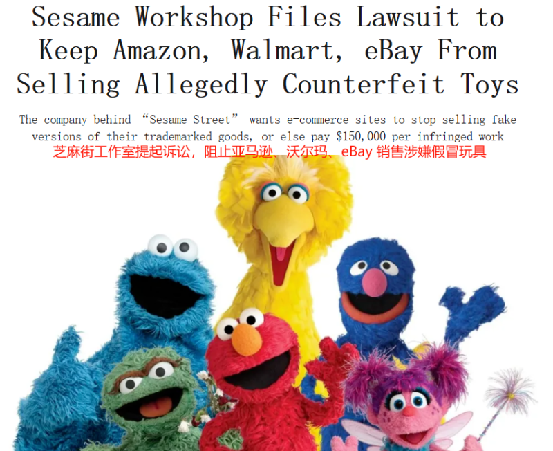 今年2月,芝麻街工作室对亚马逊、沃尔玛、eBay等电商平台提起诉讼,指控这些平台上部分卖家销售涉嫌侵犯版权的假冒商品,比如经典角色艾摩、大鸟、饼干怪兽、格罗弗等。若不立即停止销售行为,否则每个侵权商品需支持15万美金的赔偿金。
