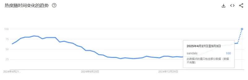 目前北半球气温逐渐升高,人们开始在夏日穿搭上下功夫。在Google Trends上搜索“sandals”(凉鞋)一词可以看到,在全球范围内,每年4月起,凉鞋一词的搜索热度持续攀升。到了5-6月份,更是搜索高峰期,甚至能达到100高位,不少人纷纷提前购置凉鞋。