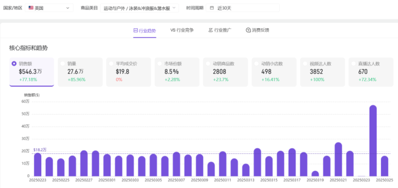 根据Gloda的数据,最近一个月内,TikTok美区泳装产品销售额突破546.3万美元,销量飙升至27.6万件。在短视频和直播营销的强力助攻下,该类目市场份额上涨至8.5%。销量排名靠前的主要是分片式泳装、褶皱系带高腰泳裤款这种高客单功能款,单款销售额达到15.1万美元。