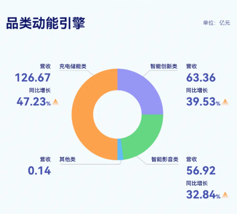 分品类来看,2024年,安克创新的充电储能类产品实现收入126.67亿元,营收同比增长 47.23%,占总营收的比例为51.26%。智能创新类产品实现收入63.36亿元,营收同比增长39.53%,占总营收的比例为25.64%。智能影音类产品实现收入56.92亿元,营收同比增长32.84%,占总营收的比例为23.04%。
