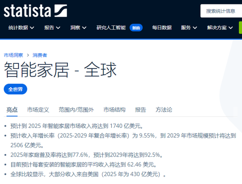 市场研究机构Statista发布的报告就指出,预计到2025年全球智能家居市场收入将达到1740亿美元,到2029年这一数值将进一步增至2506亿美元,报告期间年增长率达到9.55%。此外,智能家居的市场接受度也会不断提高,2025年智能家居产品的家庭普及率约有77.6%,预计到2029年将增长至92.5%。