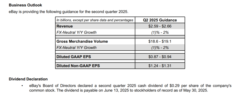 一季度,eBay产生了7.87亿美元的经营现金流和6.44亿美元的自由现金流,向股东返还7.59亿美元,其中包括6.25亿美元的股票回购和1.34亿美元的现金股息。展望未来,eBay预计2025年第二季度营收将介于25.9亿-26.6亿美元之间。