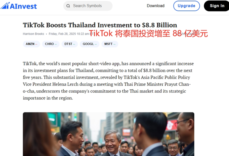 TikTok宣布在泰国投资88亿美元 图源:ainvest