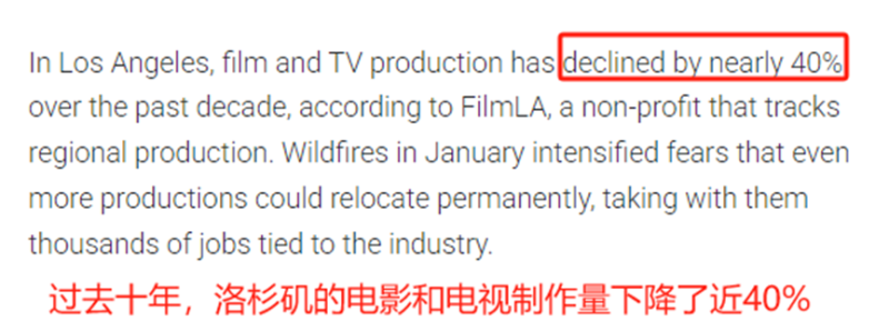 根据追踪该地区制作情况的非营利组织FilmLA的数据,过去十年间,洛杉矶的电影和电视制作量下降了近40%。而另一则数据则指出,2025年第一季度北美票房跌至1996年(除疫情期间)以来的最低水平,全年预测从97亿美元下调至95亿美元。
