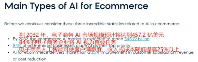 根据Bloomreach发布的数据,预计到2032年,全球人工智能电商市场规模将增至457.2亿美元。目前人工智能在电商领域最常应用于聊天机器人、定向广告、动态定价、推荐引擎等,这些技术可使客户满意度和平台收入提高25%以上,有84%的电商企业将AI视为发展首要任务。