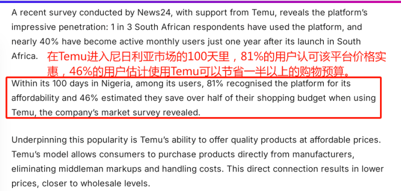 Temu通过与大量供应商建立紧密合作关系,直接从源头采购商品,省去了诸多中间环节的成本。同时,Temu采用大规模采购的方式,利用规模效应进一步压低采购价格。从数据上看,Temu的超级低价策略相当有效,上线近一个月,便登顶了美国苹果应用商店免费购物APP应用榜单第一名,超过了亚马逊。来自数据分析机构News24发布的一项调查就指出,在尼日利亚,有81%的消费者认为该平台能够以实惠的价格提供高质量产品。