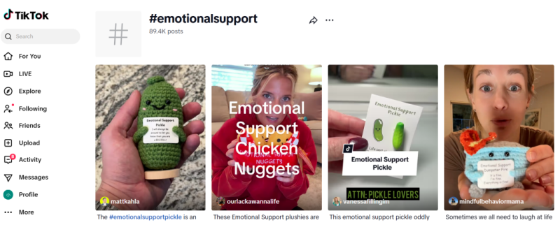 但好消息是,随着大家对自身的关注度越来越高,消费心态早已发生了变化,更愿意花时间、花钱在让自己感到愉悦的商品上。在TikTok上搜索情感支持话题,同样能看到有大量视频,并且播放量和评论互动数量也很多,大家会在这个话题中分享自己的“爱用物”,这也让不少小玩意有了更多破圈的机会。