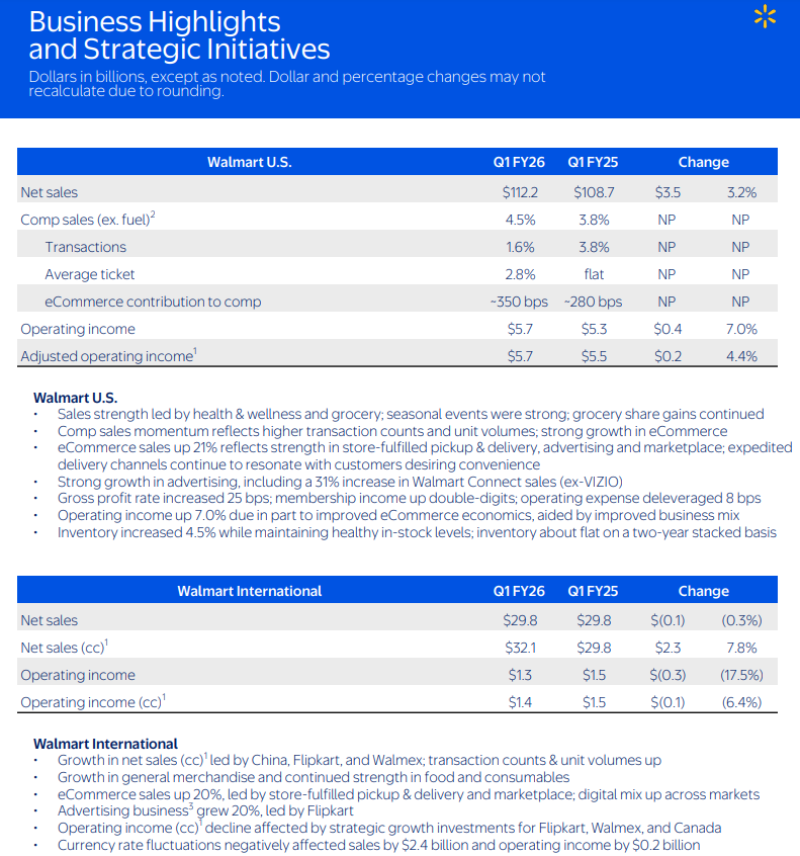展望未来,沃尔玛维持了全年预测,即本财年销售额增长3%至4%,调整后每股收益为2.5美元至2.6美元。预计第二季度销售额将增长3.5%至4.5%,但由于美国关税政策波动,沃尔玛没有提供每股收益或营业收入增长预期。
