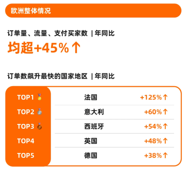 例如在今年3月阿里国际站举行的新贸节期间,欧洲市场表现最为突出。根据官方披露的数据,欧洲整体订单量、流量、支付买家数与去年同期相比,均上涨超过45%,其中订单数飙升最快的是法国,增幅达到125%,其次是意大利、西班牙、英国和德国。