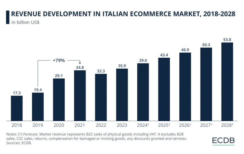 再来说说稍微小众一点的意大利电商市场,其在欧洲排名第5,在全球排名第13。在线零售占意大利零售市场的12%,预计到2028年上升至17%。市场规模将从2024年的396亿美元增长至2028年的538亿美元,期间复合年增长率为8%。