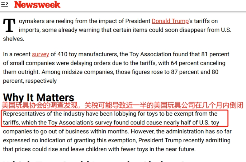 据了解,2011年成立于美国,前身是炉具制造商Solo Stove的亚马逊头部户外品牌——Solo Brands由于股价持续大跌,收到了纽约证券交易所发出的退市通知。无独有偶,在特朗普上调对华关税之后,玩具巨头美泰(Mattel)和孩之宝(Hasbro)股价也双双出现下滑。还有调查指出,受关税的影响,可能近一半的美国玩具公司在几个月内走向倒闭的命运。