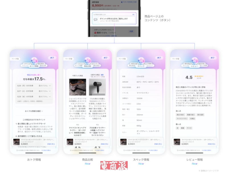 此次新推出的AI功能是继2月20日上线的“优惠日推荐功能”之后的扩展。优惠日推荐功能通过生成式AI分析过去几天的购物数据,向用户推荐最适合获取更多积分的购物日期,帮助用户把握优惠时机。新功能则进一步在商品信息展示方面进行智能优化,涵盖两个主要内容:商品评论摘要与自动比较推荐。