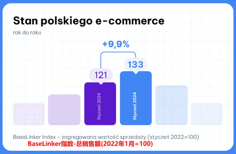 此前欧洲在线销售管理和自动化系统BaseLinker平台发布的市场数据就显示,今年1月,即使已经过了年底旺季大促,但波兰电商市场还是保持稳步增长,总销售额同比上升9.9%,订单数量同比增加5.4%,展现出较强的增长韧性。