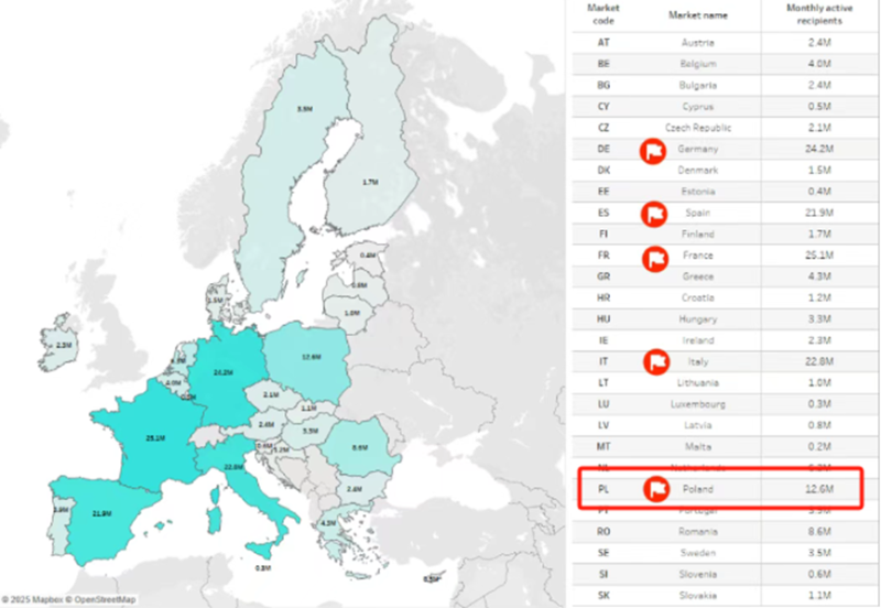 该平台此前发布的欧盟执行和使用数据报告就提到,在2024年7月至12月期间,TikTok在欧盟地区的月活跃用户规模达到1.591亿人,较上一统计周期净增长900万人。其中,波兰地区TikTok用户数量达到1260万,在全欧洲排名第五。