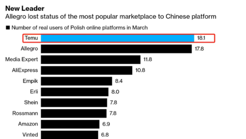 Temu波兰真实用户数量超越Allegro 图源:Bloomberg