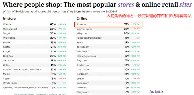 以美国市场为例,Jungle Scout发布的2025年度美国消费者趋势报告显示,2024全年有73%的消费者使用亚马逊参与网购。在所有在线零售商中,亚马逊的使用率位居第一。