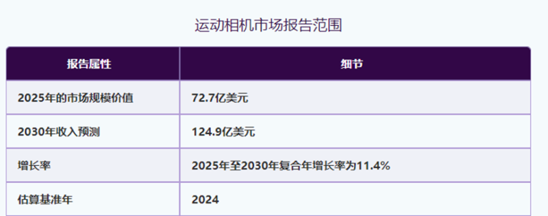 根据Grand View Research发布的报告,随着户外活动、冒险运动在全球范围内日益普及,加之社交媒体平台内容创作蓬勃发展,全球运动相机市场加速爆发。预计2025年全球运动相机市场规模将达到72.7亿美元,到2030年扩大至124.9亿美元,期间复合年增长率达11.4%。