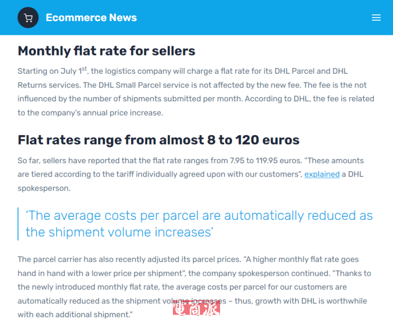 DHL发言人表示:“通过新的月度固定费用,客户的平均包裹成本随着寄送量的提升而下降,因此,与DHL合作的业务增长将随着每一笔新增发货而更具价值。”