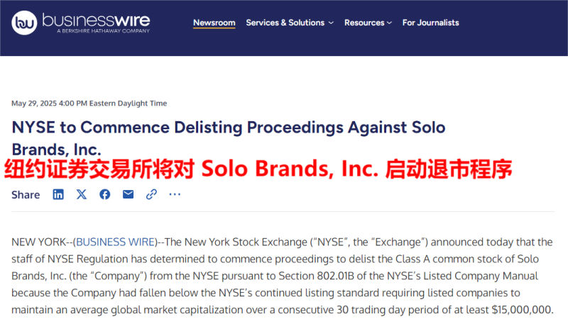 纽交所对Solo Brands启动退市程序 图源:business wire